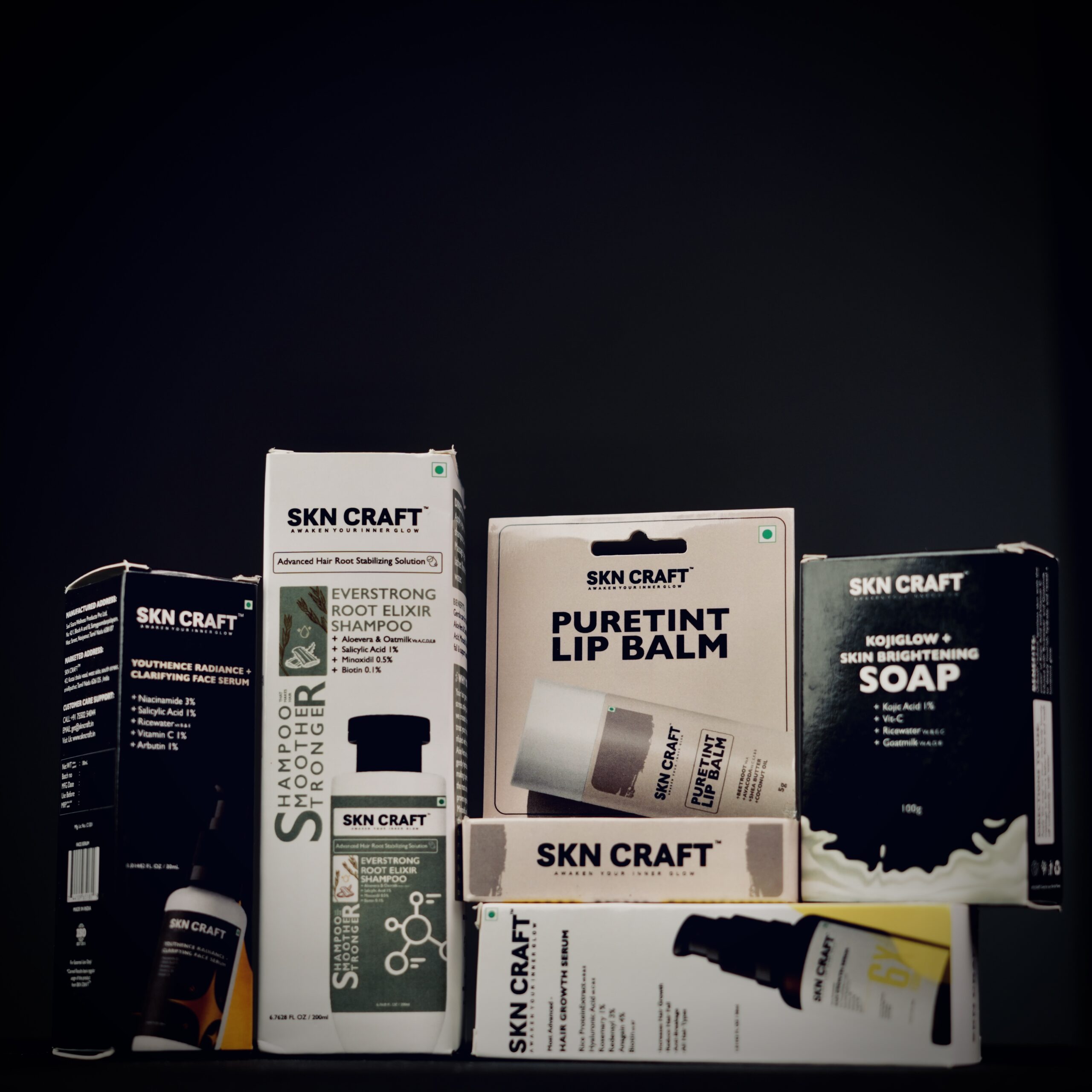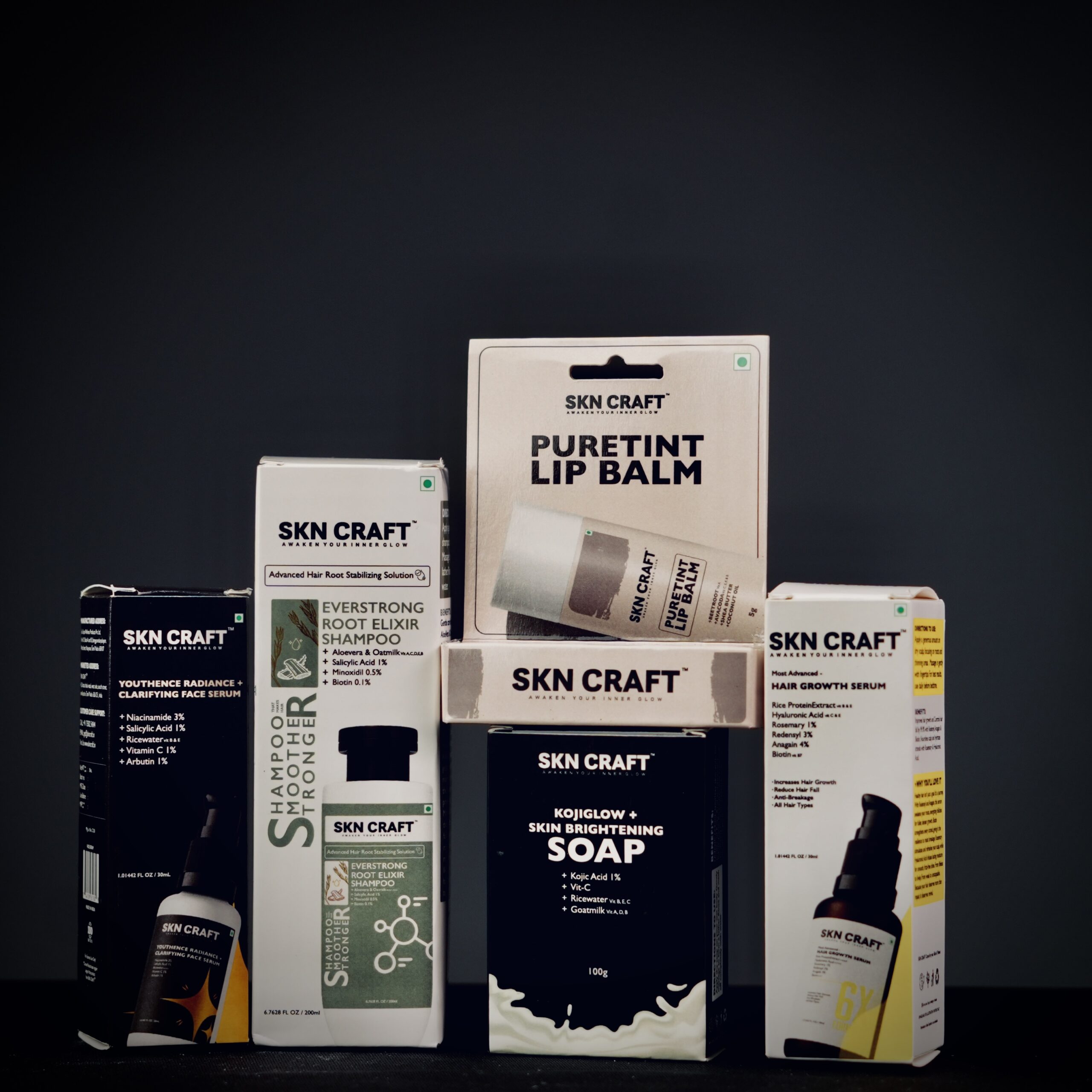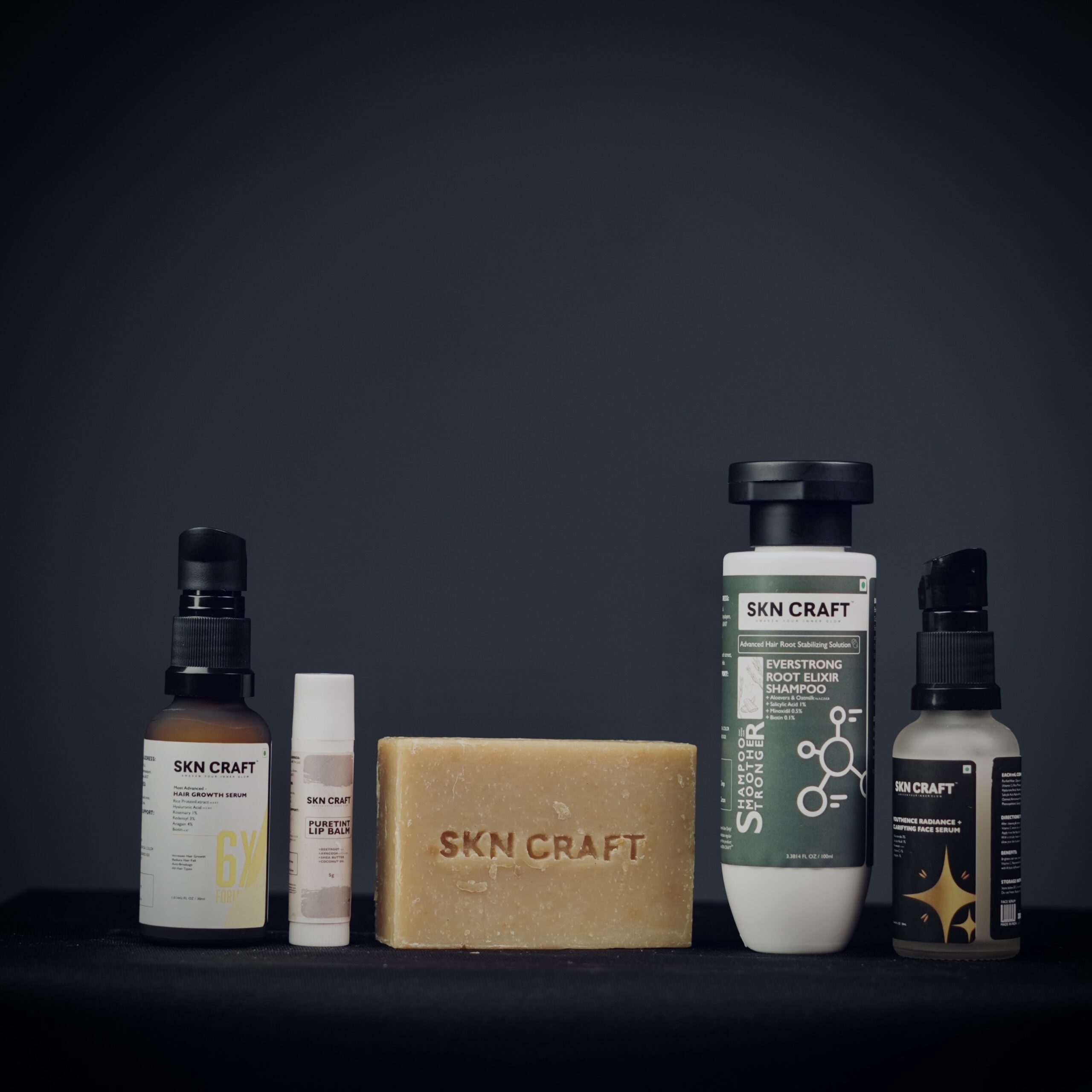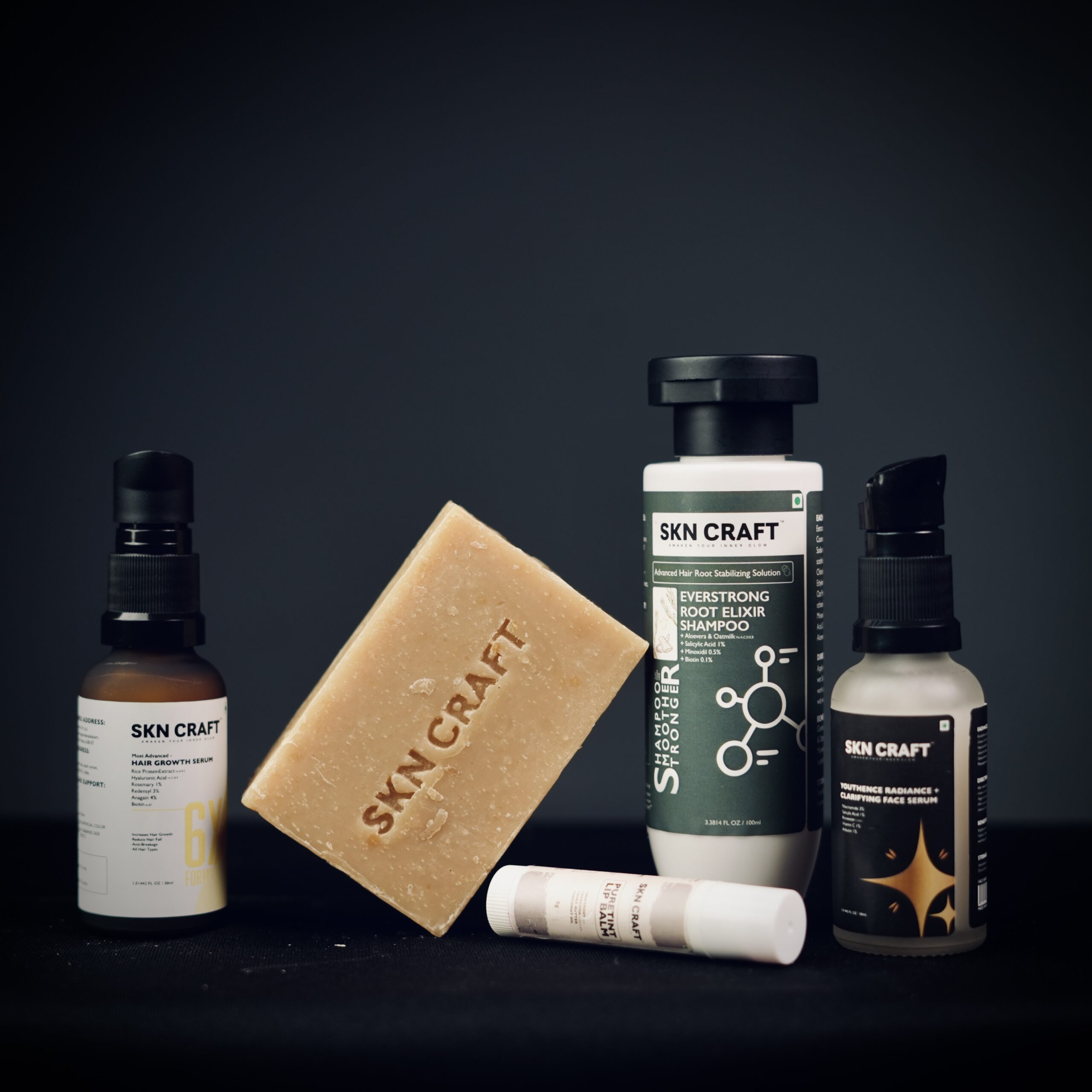 Complete skincare & haircare combo with soap, shampoo, face serum, hair serum, and lip balm.